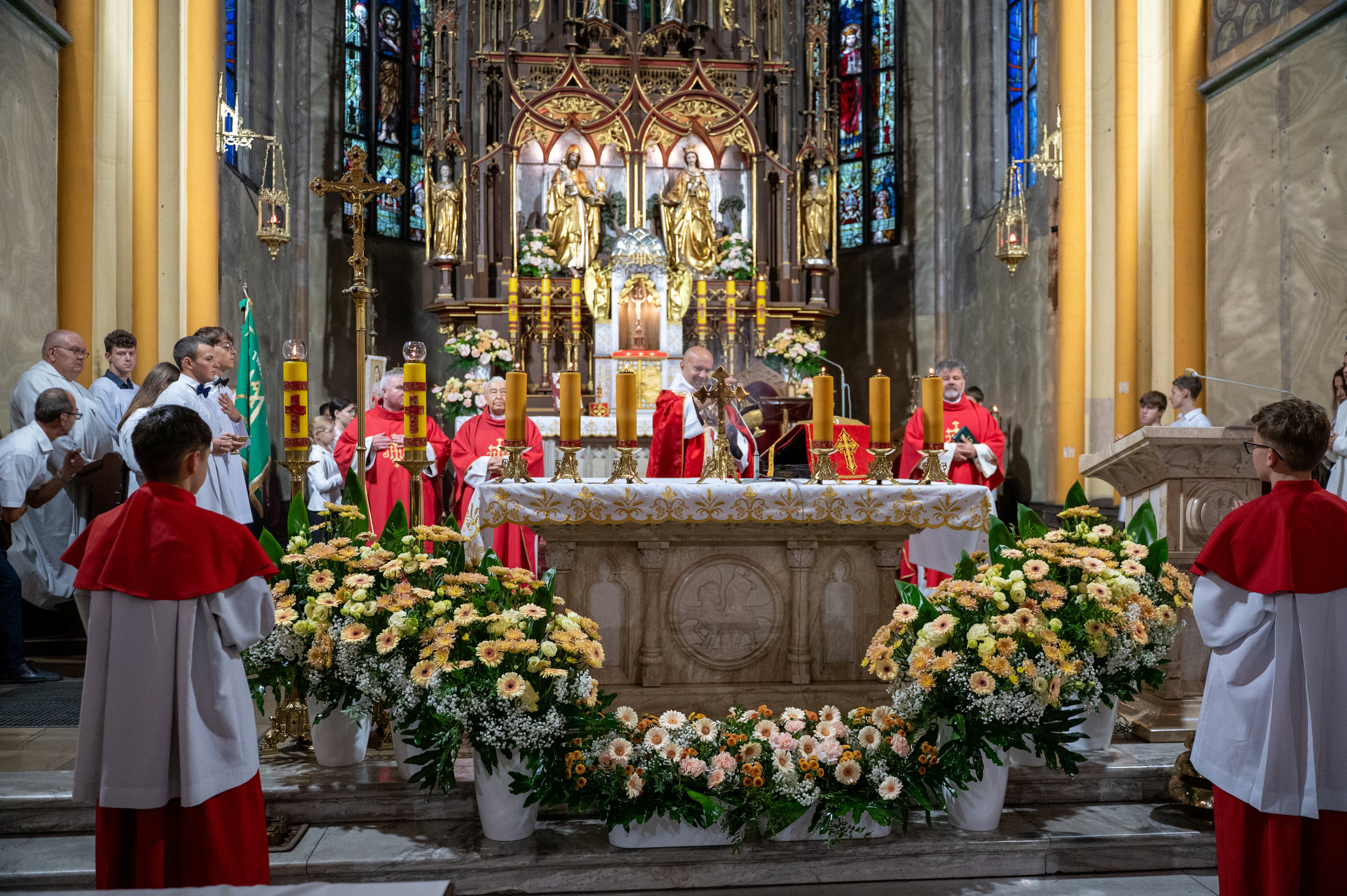 Nasza uroczystość odpustowa była starannie przygotowywana przez wielu ludzi, co zaowocowało jej pięknym przeżyciem. Najważniejszym punktem obchodów Święta Podwyższenia Krzyża Świętego była suma, której przewodniczył o. Patryk Siarkiewicz OFM – odpustowy kaznodzieja. Przy ołtarzu stanęli także ks. Proboszcz, ks. Jan i Ojciec Werbista z Parafii Św. Małgorzaty w Bytomiu. Chór parafialny przygotował śpiewy podczas liturgii, zagrała też orkiestra. Nie zawiedli ministranci oraz licznie zgromadzone Dzieci Maryi. Ze sztandarami stanęli również górnicy. Na Mszę św. przybyło wielu Parafian i Gości na czele z naszymi Siostrami Elżbietankami. Wszystko było pięknie. Od rana nie dopisywała jedynie pogoda… Procesja po sumie odbyła się w kościele z powodu ulewnego deszczu.