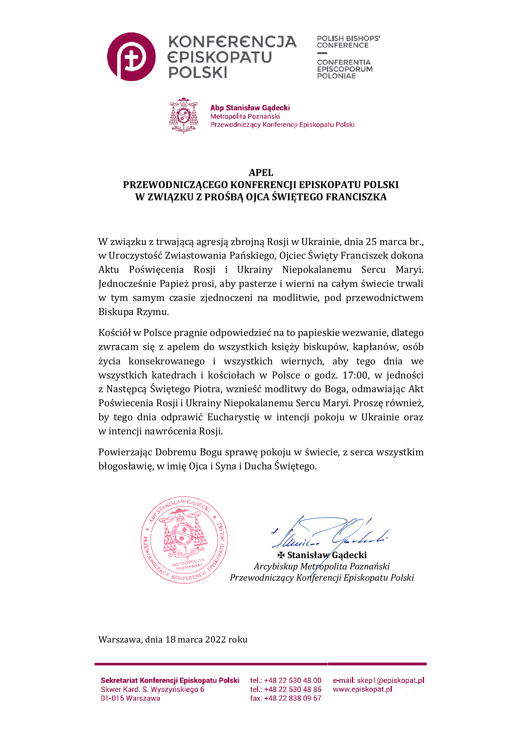 Apel przewodniczącego Episkopatu Polski w związku z prośbą Ojca Świętego Franciszka