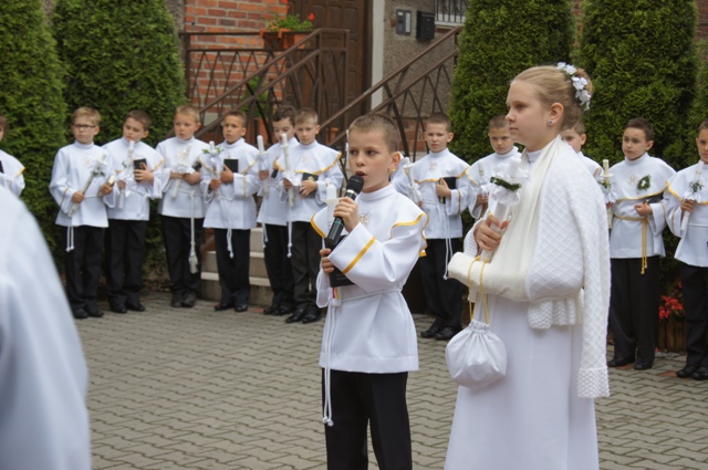 Rok przygotowań, katechezy, Msze św., nabożeństwa, pierwsza spowiedź św., lekcje religii – to wszystko miało zaowocować 24 maja. To właśnie wtedy 75-osobowa grupa naszych dzieci po raz pierwszy w pełni uczestniczyła we Mszy św. Ranek był pochmurny i chłodny, ale do kościoła udało nam się wejść bez deszczu. Wszyscy trzecioklasiści byli bardzo szczęśliwi i podekscytowani zbliżającym się wielkimi krokami niezwykłym Gościem, którego mieli powitać w swoich sercach.