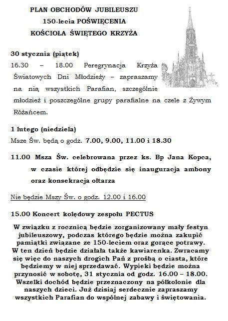 Plan obchodów jubileuszu 150-lecia poświęcenia Kościoła Św. Krzyża