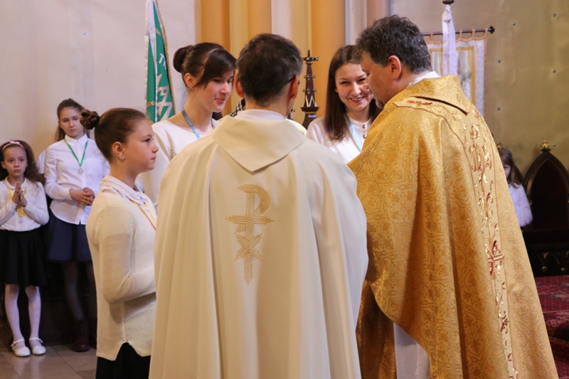 W sobotę, 25 maja, Dzieci Maryi zaprosiły naszych duszpasterzy do salki katechetycznej, ponieważ przygotowały prezent z okazji kolejnej rocznicy święceń kapłańskich. Ofiarowałyśmy Księżom trud włożony w realizację przedstawienia o Mszy świętej. Z pomocą przyszli nam nasi koledzy – ministranci, którzy zagrali męskie role. Pozostali chłopcy też chcieli zobaczyć inscenizację, więc byliśmy wszyscy razem – marianki, ministranci i nasi Pasterze.