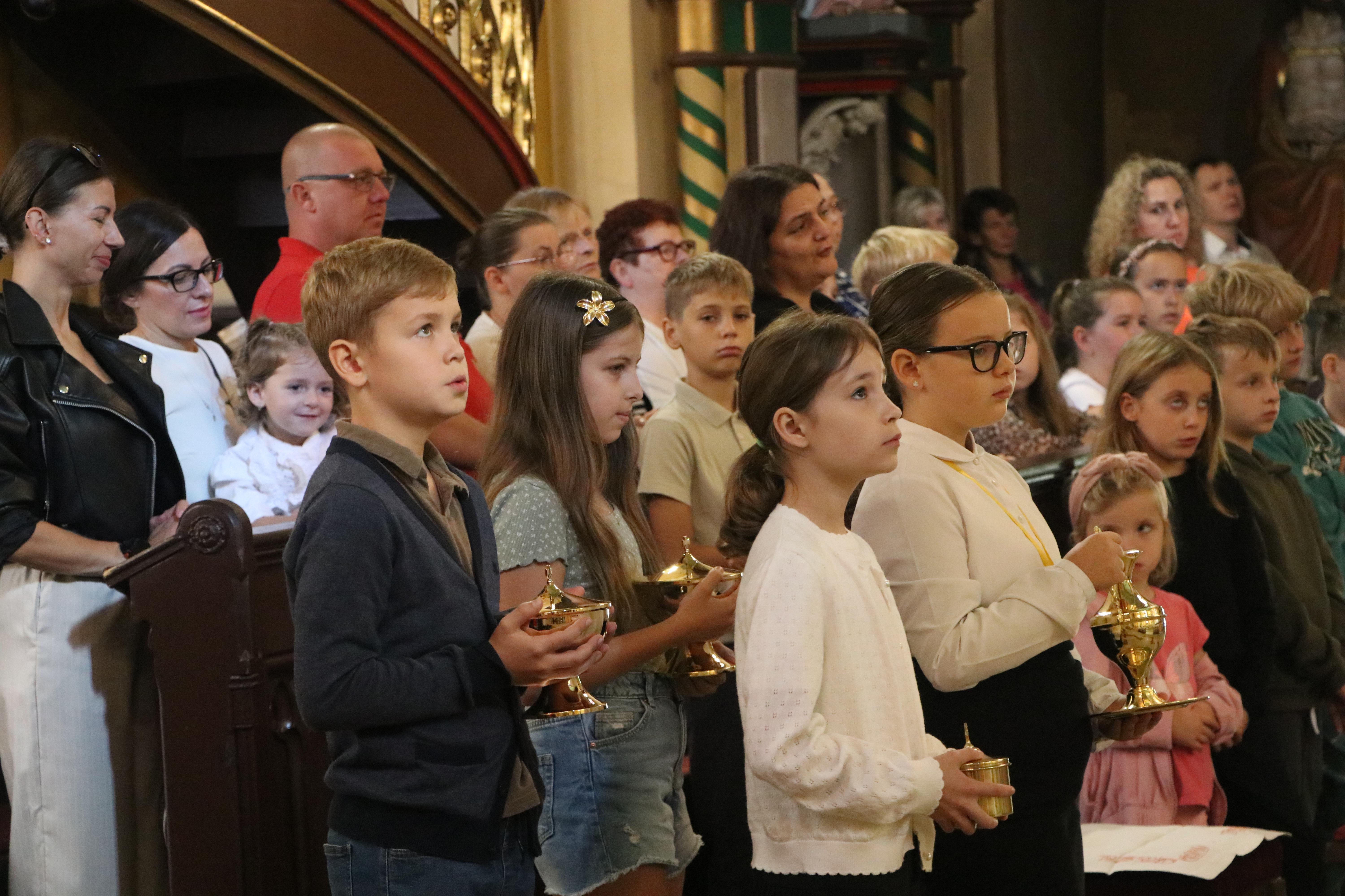 Ten szczególny czas rozpoczął się dla 35 dzieci z klas III w tym roku szkolno-katechetycznym 21 września podczas Mszy świętej o godz. 9.00. Otrzymały one na czas przygotowania do I Komunii Świętej uroczyste błogosławieństwo od rodziców i Kościoła oraz medaliki z Jezusem Miłosiernym. W czasie tej Eucharystii poświęcono także dary dzieci komunijnych, które w maju tego roku przyjęły pierwszy raz Pana Jezusa do swojego serca. Parafia otrzymała dwie puszki do rozdawania Komunii Świętej pod dwiema postaciami, piękny neogotycki dzbanek z miską do obmywania rąk w czasie Mszy świętej przez kapłana oraz pozłacane naczynie do przechowywania dużych komunikantów. Z serca dziękujemy dzieciom i ich rodzicom za ten piękny dar, jednak aby on miał sens i spełniał swoje zadanie, potrzebne są serca dzieci i dorosłych na Eucharystii, którzy będą jak najczęściej przyjmować Komunię Świętą. O to będziemy się modlić, aby ta szczególna więź z Jezusem nie została zapomniana przez dzieci i ich rodziców. Szkoda by było, gdyby rodzice ten błogosławiony czas przygotowania przegapili, bo tak jak każdy kairos, on już nigdy nie wróci.