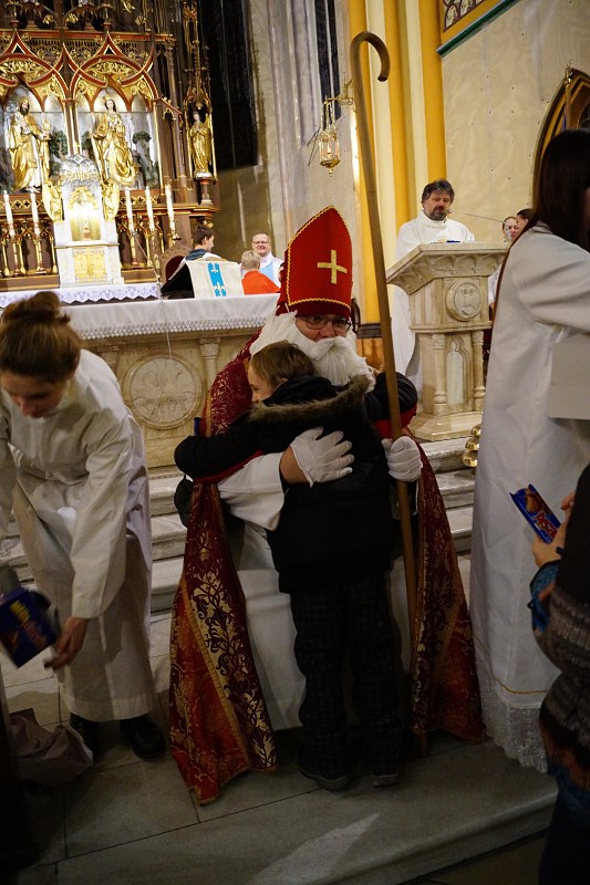 We wtorek, 6 grudnia o godz. 17.00, nasz kościół zapełnił się dziećmi, młodzieżą i dorosłymi, którzy przyszli uczestniczyć we Mszy świętej Roratniej. Dzieci tego dnia były szczególnie radosne, bo swoją wizytę zapowiedział ktoś dobrze nam znany – człowiek kochający Boga i ludzi. Na zakończenie Mszy świętej ks. Joachim opowiedział dzieciom o życiu św. Mikołaja – Biskupa Mirry i zachęcał, aby każdy z nas potrafił go naśladować w czynieniu miłości i dobra.
